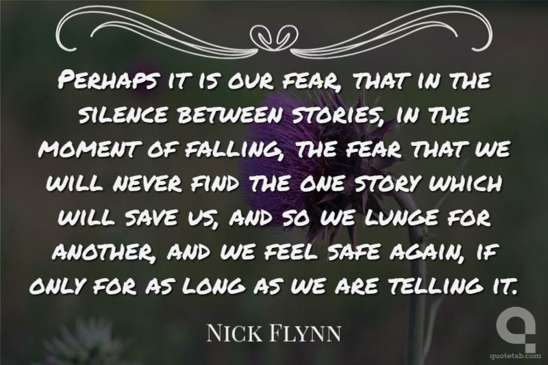 Perhaps it is our fear, that in the silence between stories, in the moment of falling, the fear that we will never find the one story which will save us, and so we lunge for another, and we feel safe again, if only for as long as we are telling it.