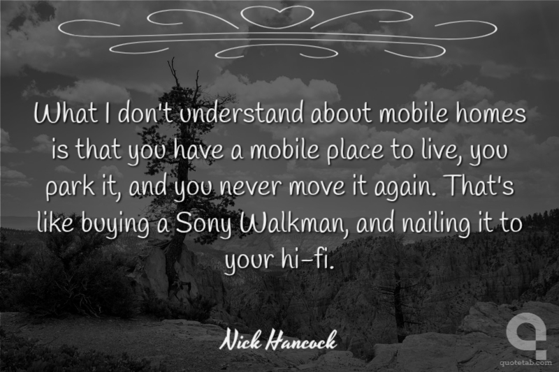 What I don't understand about mobile homes is that you have a mobile place to live, you park it, and you never move it again. That's like buying a Sony Walkman, and nailing it to your hi-fi.