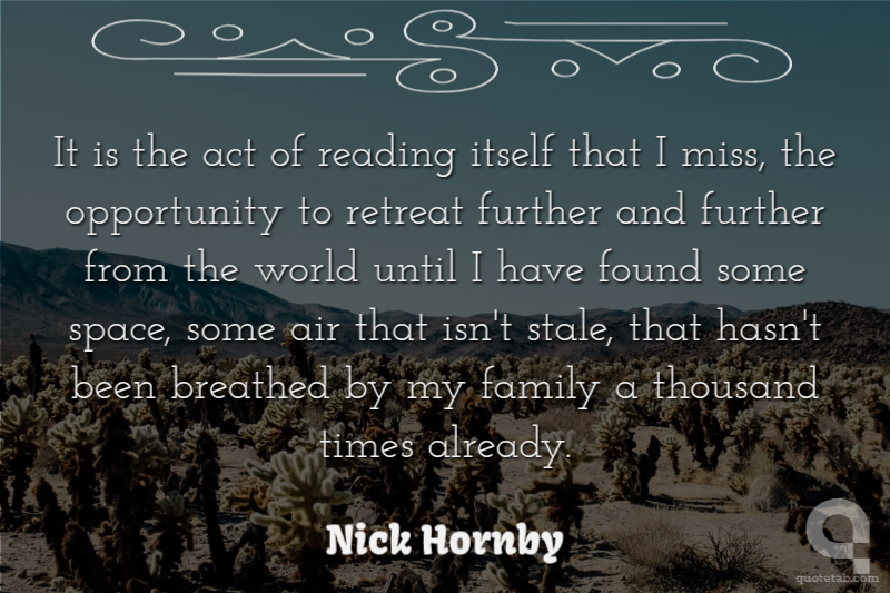 It is the act of reading itself that I miss, the opportunity to retreat further and further from the world until I have found some space, some air that isn't stale, that hasn't been breathed by my family a thousand times already.