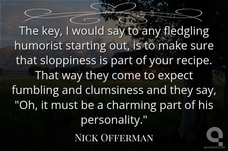 The key, I would say to any fledgling humorist starting out, is to make sure that sloppiness is part of your recipe. That way they come to expect fumbling and clumsiness and they say, "Oh, it must be a charming part of his personality."