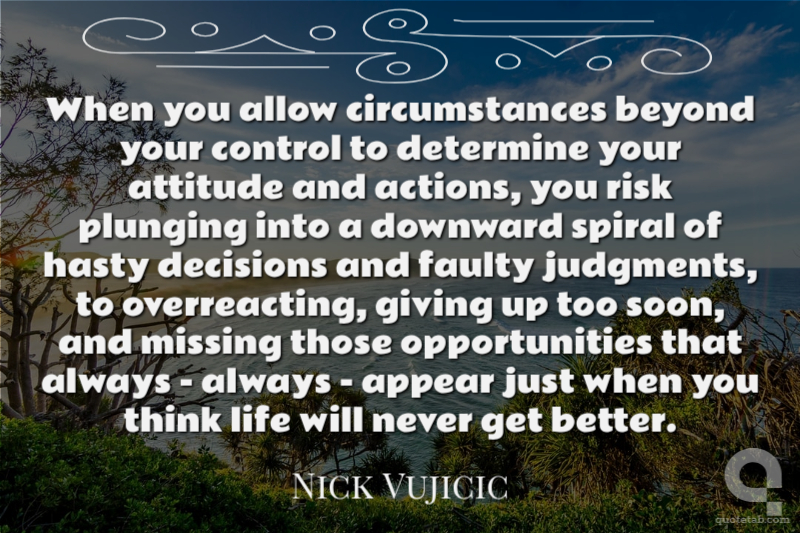 When you allow circumstances beyond your control to determine your attitude and actions, you risk plunging into a downward spiral of hasty decisions and faulty judgments, to overreacting, giving up too soon, and missing those opportunities that always - always - appear just when you think life will never get better.