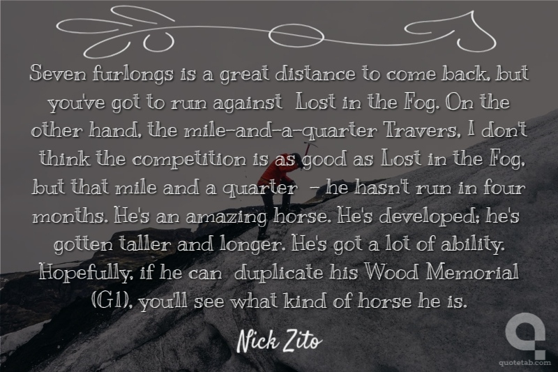 Seven furlongs is a great distance to come back, but you've got to run against Lost in the Fog. On the other hand, the mile-and-a-quarter Travers, I don't think the competition is as good as Lost in the Fog, but that mile and a quarter - he hasn't run in four months. He's an amazing horse. He's developed; he's gotten taller and longer. He's got a lot of ability. Hopefully, if he can duplicate his Wood Memorial (G1), you'll see what kind of horse he is.