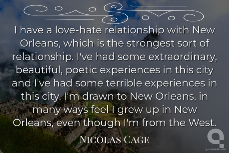 I have a love-hate relationship with New Orleans, which is the strongest sort of relationship. I've had some extraordinary, beautiful, poetic experiences in this city and I've had some terrible experiences in this city. I'm drawn to New Orleans, in many ways feel I grew up in New Orleans, even though I'm from the West.