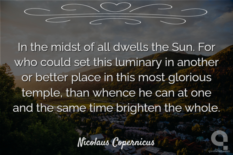In the midst of all dwells the Sun. For who could set this luminary in another or better place in this most glorious temple, than whence he can at one and the same time brighten the whole.