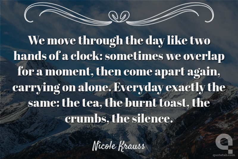 We move through the day like two hands of a clock: sometimes we overlap for a moment, then come apart again, carrying on alone. Everyday exactly the same: the tea, the burnt toast, the crumbs, the silence.