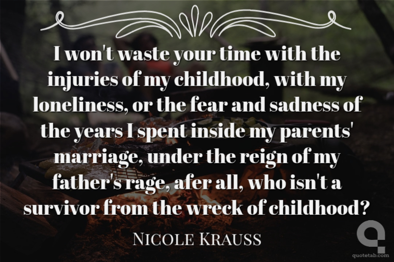 I won't waste your time with the injuries of my childhood, with my loneliness, or the fear and sadness of the years I spent inside my parents' marriage, under the reign of my father's rage, afer all, who isn't a survivor from the wreck of childhood?
