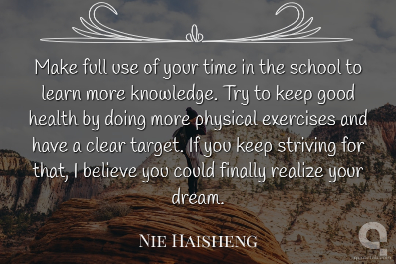 Make full use of your time in the school to learn more knowledge. Try to keep good health by doing more physical exercises and have a clear target. If you keep striving for that, I believe you could finally realize your dream.