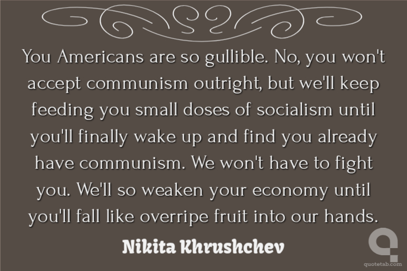 You Americans are so gullible. No, you won't accept communism outright, but we'll keep feeding you small doses of socialism until you'll finally wake up and find you already have communism. We won't have to fight you. We'll so weaken your economy until you'll fall like overripe fruit into our hands.