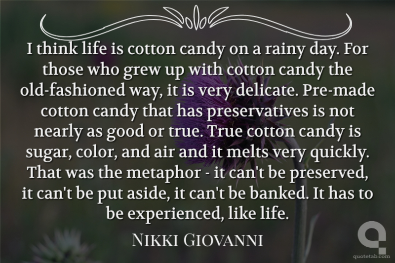 I think life is cotton candy on a rainy day. For those who grew up with cotton candy the old-fashioned way, it is very delicate. Pre-made cotton candy that has preservatives is not nearly as good or true. True cotton candy is sugar, color, and air and it melts very quickly. That was the metaphor - it can't be preserved, it can't be put aside, it can't be banked. It has to be experienced, like life.