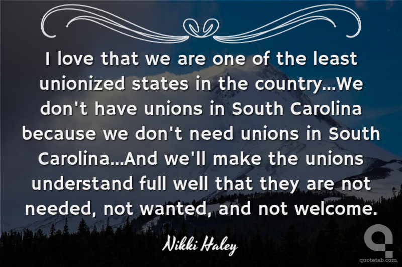 I love that we are one of the least unionized states in the country...We don't have unions in South Carolina because we don't need unions in South Carolina...And we'll make the unions understand full well that they are not needed, not wanted, and not welcome.