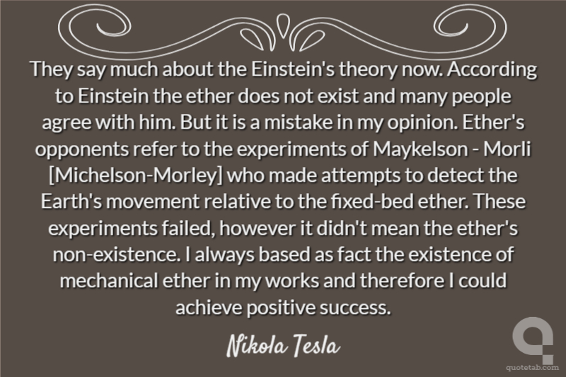 They say much about the Einstein's theory now. According to Einstein the ether does not exist and many people agree with him. But it is a mistake in my opinion. Ether's opponents refer to the experiments of Maykelson - Morli [Michelson-Morley] who made attempts to detect the Earth's movement relative to the fixed-bed ether. These experiments failed, however it didn't mean the ether's non-existence. I always based as fact the existence of mechanical ether in my works and therefore I could achieve positive success.