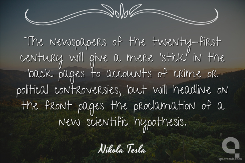 The newspapers of the twenty-first century will give a mere 'stick' in the back pages to accounts of crime or political controversies, but will headline on the front pages the proclamation of a new scientific hypothesis.