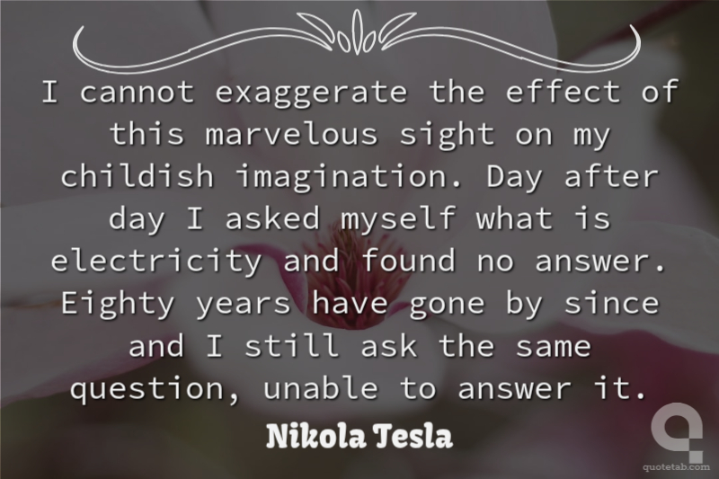 I cannot exaggerate the effect of this marvelous sight on my childish imagination. Day after day I asked myself what is electricity and found no answer. Eighty years have gone by since and I still ask the same question, unable to answer it.