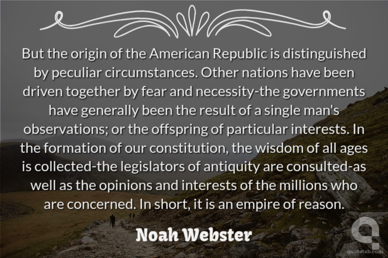 But the origin of the American Republic is distinguished by peculiar circumstances. Other nations have been driven together by fear and necessity-the governments have generally been the result of a single man's observations; or the offspring of particular interests. In the formation of our constitution, the wisdom of all ages is collected-the legislators of antiquity are consulted-as well as the opinions and interests of the millions who are concerned. In short, it is an empire of reason.