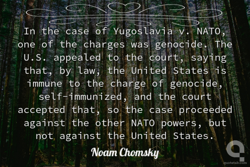 In the case of Yugoslavia v. NATO, one of the charges was genocide. The U.S. appealed to the court, saying that, by law, the United States is immune to the charge of genocide, self-immunized, and the court accepted that, so the case proceeded against the other NATO powers, but not against the United States.