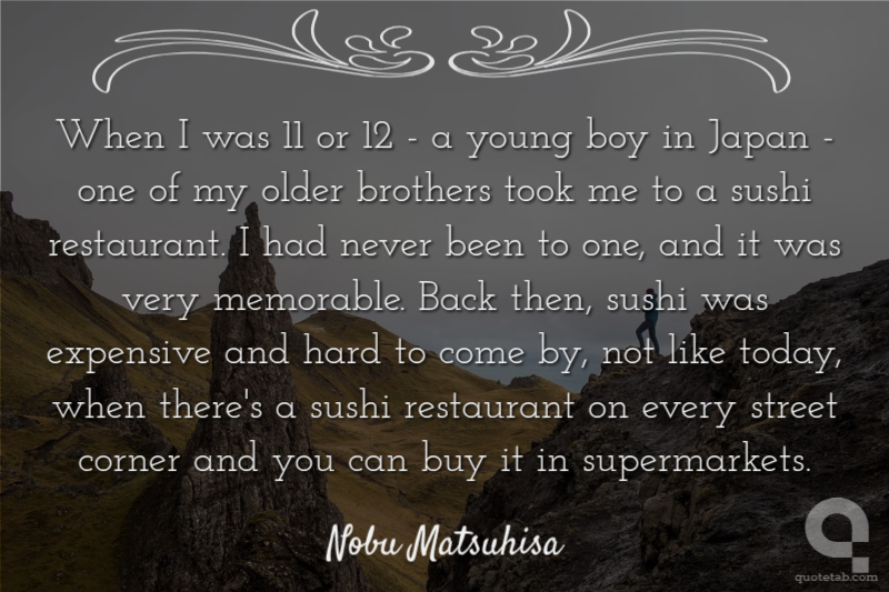 When I was 11 or 12 - a young boy in Japan - one of my older brothers took me to a sushi restaurant. I had never been to one, and it was very memorable. Back then, sushi was expensive and hard to come by, not like today, when there's a sushi restaurant on every street corner and you can buy it in supermarkets.