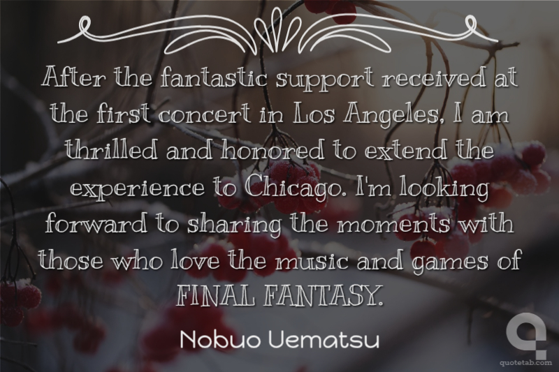 After the fantastic support received at the first concert in Los Angeles, I am thrilled and honored to extend the experience to Chicago. I'm looking forward to sharing the moments with those who love the music and games of FINAL FANTASY.