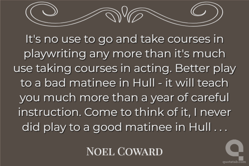It's no use to go and take courses in playwriting any more than it's much use taking courses in acting. Better play to a bad matinee in Hull - it will teach you much more than a year of careful instruction. Come to think of it, I never did play to a good matinee in Hull . . .
