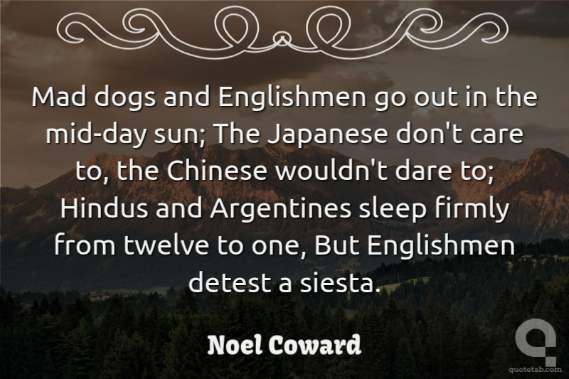 Mad dogs and Englishmen go out in the mid-day sun; The Japanese don't care to, the Chinese wouldn't dare to; Hindus and Argentines sleep firmly from twelve to one, But Englishmen detest a siesta.