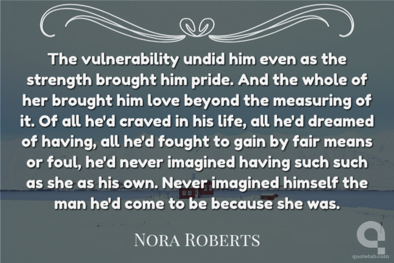 The vulnerability undid him even as the strength brought him pride. And the whole of her brought him love beyond the measuring of it. Of all he'd craved in his life, all he'd dreamed of having, all he'd fought to gain by fair means or foul, he'd never imagined having such such as she as his own. Never imagined himself the man he'd come to be because she was.