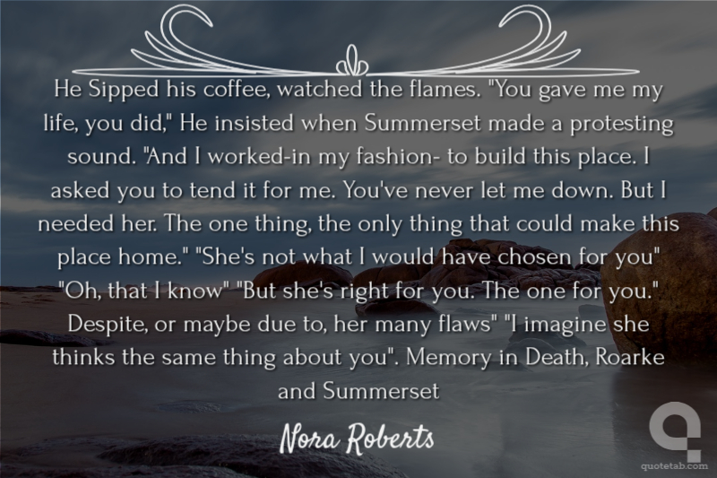 He Sipped his coffee, watched the flames. "You gave me my life, you did," He insisted when Summerset made a protesting sound. "And I worked-in my fashion- to build this place. I asked you to tend it for me. You've never let me down. But I needed her. The one thing, the only thing that could make this place home." "She's not what I would have chosen for you" "Oh, that I know" "But she's right for you. The one for you." Despite, or maybe due to, her many flaws" "I imagine she thinks the same thing about you". Memory in Death, Roarke and Summerset