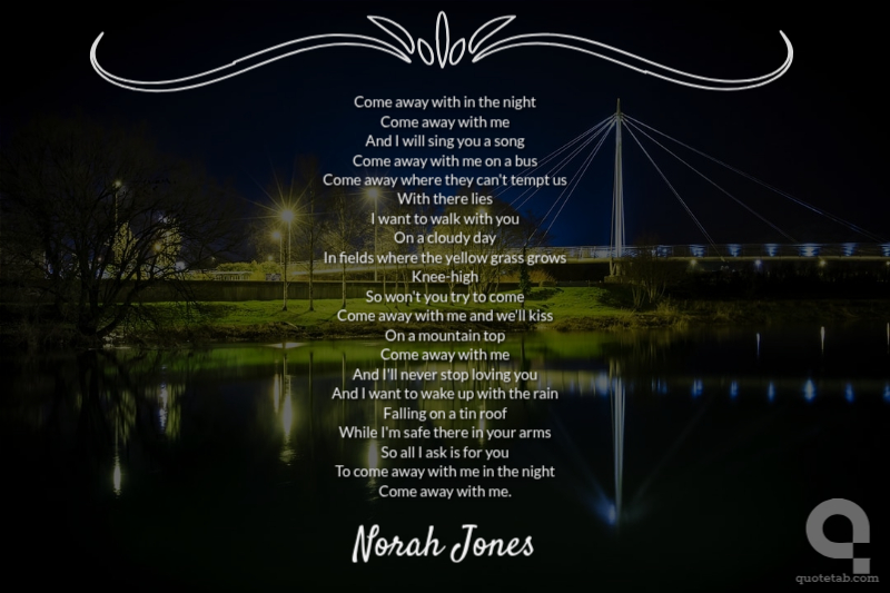 Come away with in the night Come away with me And I will sing you a song Come away with me on a bus Come away where they can't tempt us With there lies I want to walk with you On a cloudy day In fields where the yellow grass grows Knee-high So won't you try to come Come away with me and we'll kiss On a mountain top Come away with me And I'll never stop loving you And I want to wake up with the rain Falling on a tin roof While I'm safe there in your arms So all I ask is for you To come away with me in the night Come away with me.