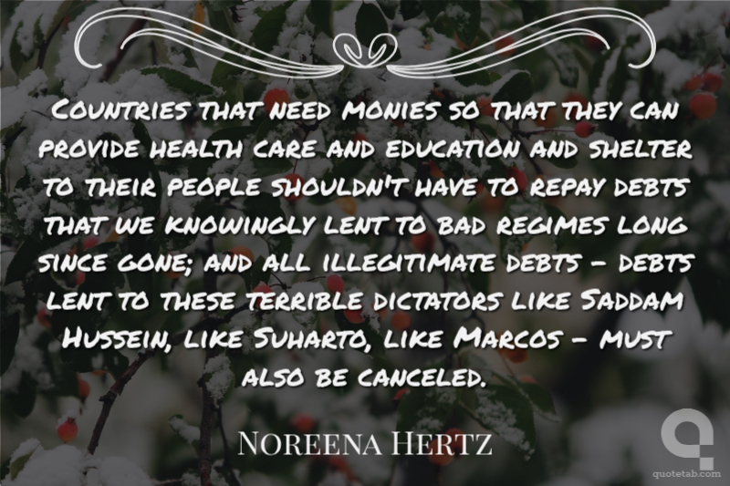 Countries that need monies so that they can provide health care and education and shelter to their people shouldn't have to repay debts that we knowingly lent to bad regimes long since gone; and all illegitimate debts - debts lent to these terrible dictators like Saddam Hussein, like Suharto, like Marcos - must also be canceled.
