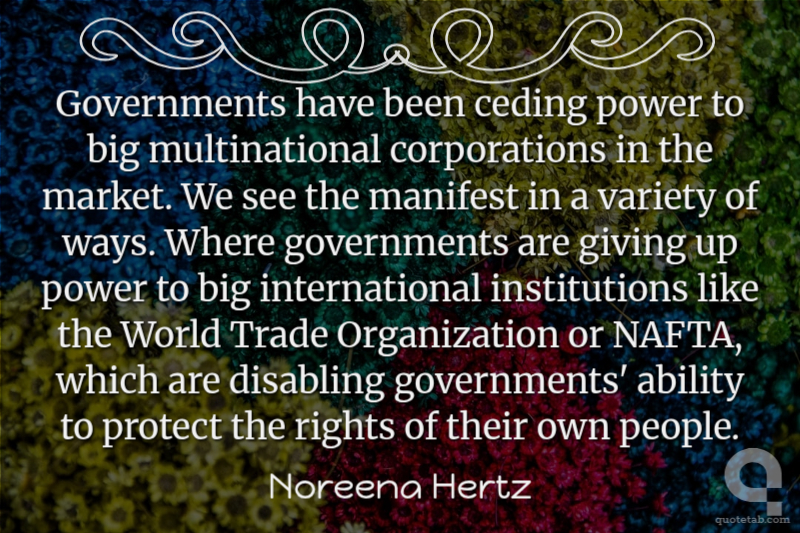 Governments have been ceding power to big multinational corporations in the market. We see the manifest in a variety of ways. Where governments are giving up power to big international institutions like the World Trade Organization or NAFTA, which are disabling governments' ability to protect the rights of their own people.