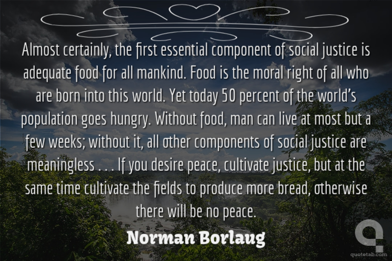 Almost certainly, the first essential component of social justice is adequate food for all mankind. Food is the moral right of all who are born into this world. Yet today 50 percent of the world’s population goes hungry. Without food, man can live at most but a few weeks; without it, all other components of social justice are meaningless . . . If you desire peace, cultivate justice, but at the same time cultivate the fields to produce more bread, otherwise there will be no peace.