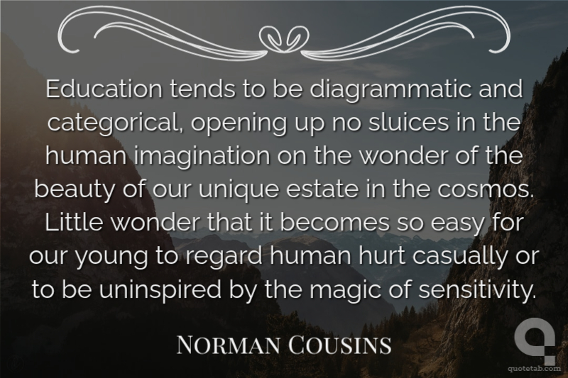Education tends to be diagrammatic and categorical, opening up no sluices in the human imagination on the wonder of the beauty of our unique estate in the cosmos. Little wonder that it becomes so easy for our young to regard human hurt casually or to be uninspired by the magic of sensitivity.