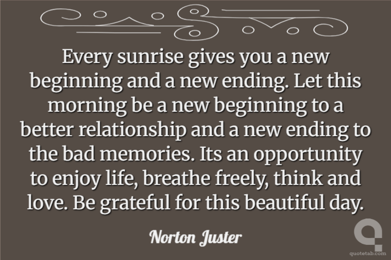 Every sunrise gives you a new beginning and a new ending. Let this morning be a new beginning to a better relationship and a new ending to the bad memories. Its an opportunity to enjoy life, breathe freely, think and love. Be grateful for this beautiful day.