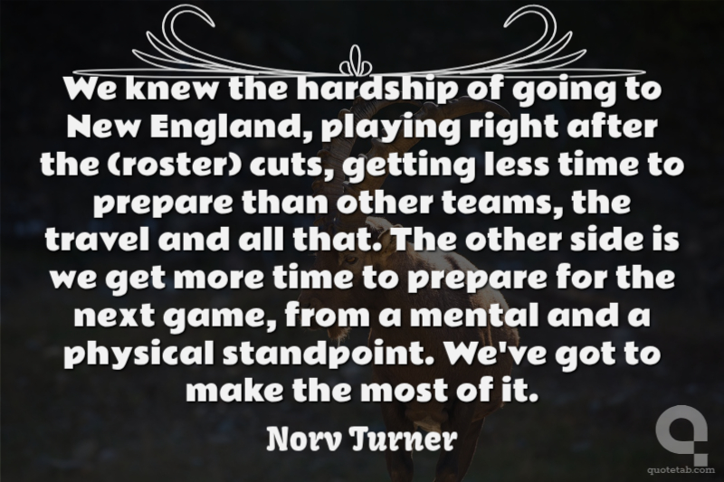 We knew the hardship of going to New England, playing right after the (roster) cuts, getting less time to prepare than other teams, the travel and all that. The other side is we get more time to prepare for the next game, from a mental and a physical standpoint. We've got to make the most of it.