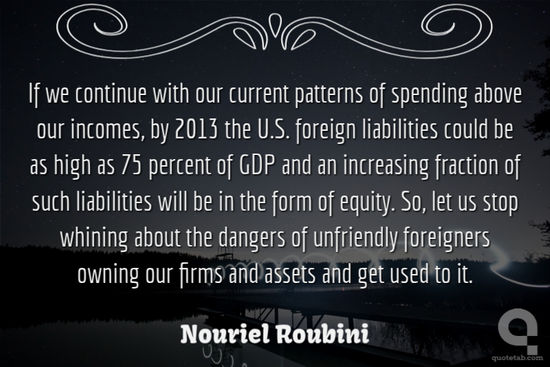 If we continue with our current patterns of spending above our incomes, by 2013 the U.S. foreign liabilities could be as high as 75 percent of GDP and an increasing fraction of such liabilities will be in the form of equity. So, let us stop whining about the dangers of unfriendly foreigners owning our firms and assets and get used to it.