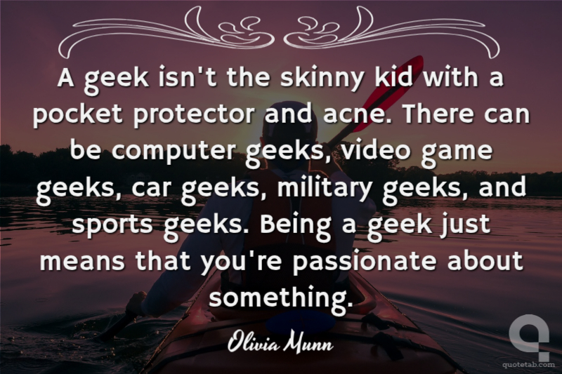 A geek isn't the skinny kid with a pocket protector and acne. There can be computer geeks, video game geeks, car geeks, military geeks, and sports geeks. Being a geek just means that you're passionate about something.