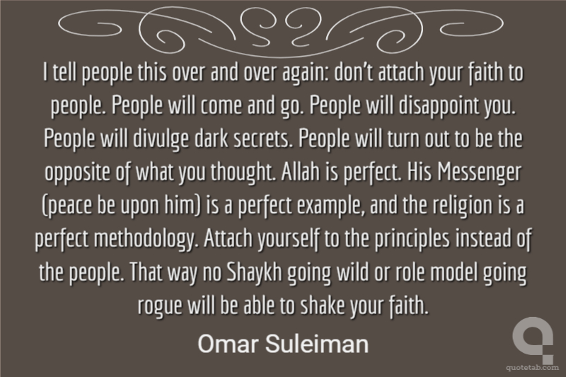 I tell people this over and over again: don't attach your faith to people. People will come and go. People will disappoint you. People will divulge dark secrets. People will turn out to be the opposite of what you thought. Allah is perfect. His Messenger (peace be upon him) is a perfect example, and the religion is a perfect methodology. Attach yourself to the principles instead of the people. That way no Shaykh going wild or role model going rogue will be able to shake your faith.
