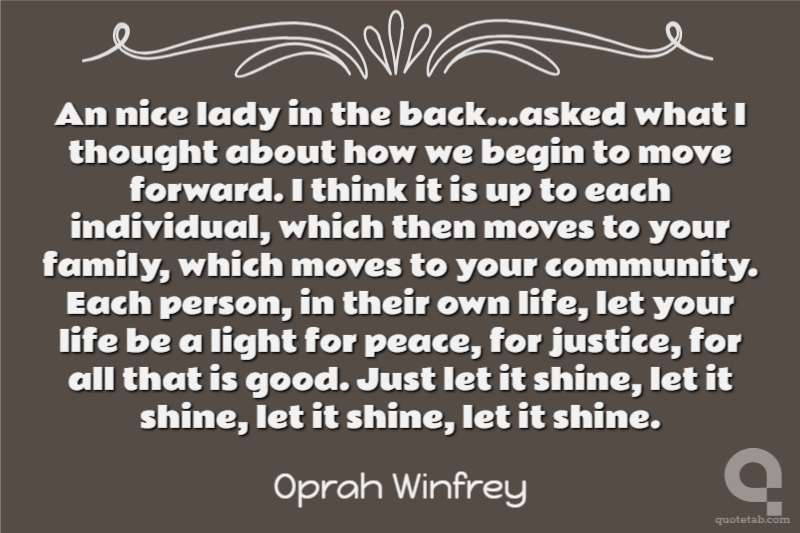 An nice lady in the back...asked what I thought about how we begin to move forward. I think it is up to each individual, which then moves to your family, which moves to your community. Each person, in their own life, let your life be a light for peace, for justice, for all that is good. Just let it shine, let it shine, let it shine, let it shine.