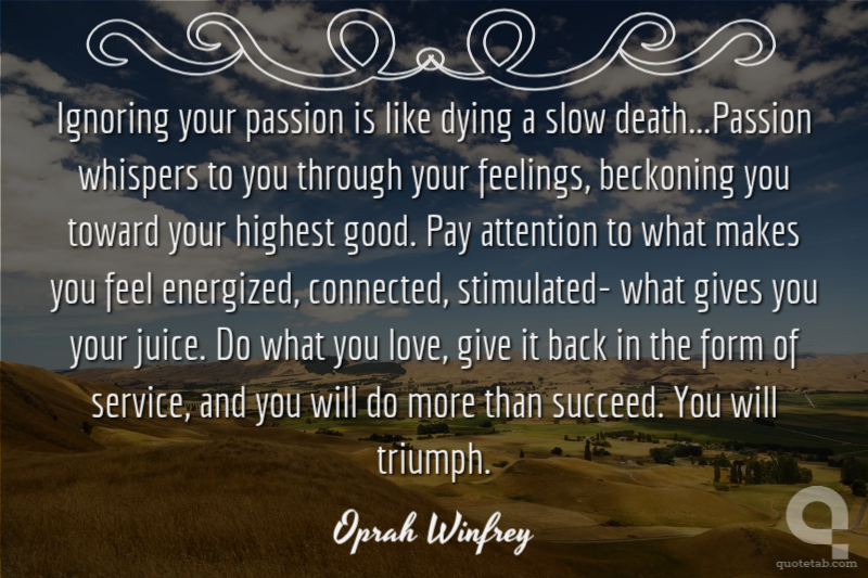 Ignoring your passion is like dying a slow death...Passion whispers to you through your feelings, beckoning you toward your highest good. Pay attention to what makes you feel energized, connected, stimulated- what gives you your juice. Do what you love, give it back in the form of service, and you will do more than succeed. You will triumph.