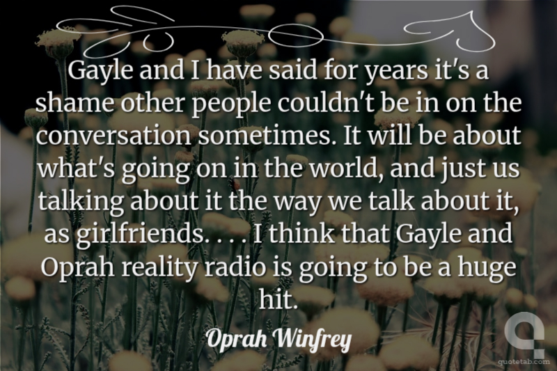 Gayle and I have said for years it's a shame other people couldn't be in on the conversation sometimes. It will be about what's going on in the world, and just us talking about it the way we talk about it, as girlfriends. . . . I think that Gayle and Oprah reality radio is going to be a huge hit.