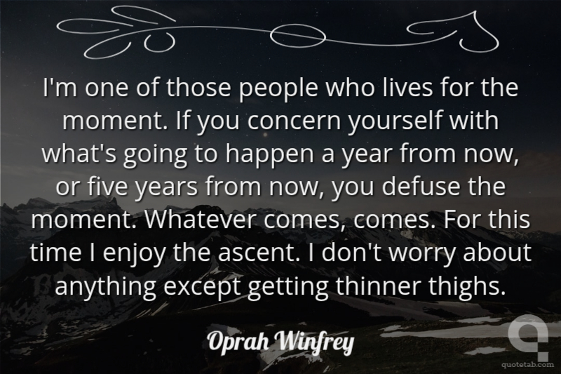I'm one of those people who lives for the moment. If you concern yourself with what's going to happen a year from now, or five years from now, you defuse the moment. Whatever comes, comes. For this time I enjoy the ascent. I don't worry about anything except getting thinner thighs.