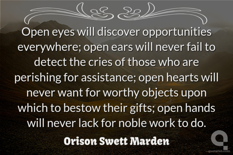 Open eyes will discover opportunities everywhere; open ears will never fail to detect the cries of those who are perishing for assistance; open hearts will never want for worthy objects upon which to bestow their gifts; open hands will never lack for noble work to do.
