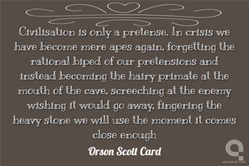 Civilisation is only a pretense. In crisis we have become mere apes again, forgetting the rational biped of our pretensions and instead becoming the hairy primate at the mouth of the cave, screeching at the enemy wishing it would go away, fingering the heavy stone we will use the moment it comes close enough
