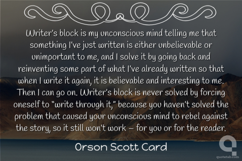 Writer’s block is my unconscious mind telling me that something I’ve just written is either unbelievable or unimportant to me, and I solve it by going back and reinventing some part of what I’ve already written so that when I write it again, it is believable and interesting to me. Then I can go on. Writer’s block is never solved by forcing oneself to “write through it,” because you haven’t solved the problem that caused your unconscious mind to rebel against the story, so it still won’t work – for you or for the reader.