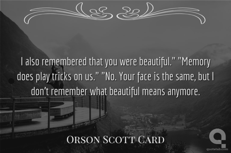 I also remembered that you were beautiful." "Memory does play tricks on us." "No. Your face is the same, but I don't remember what beautiful means anymore.