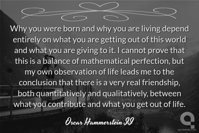 Why you were born and why you are living depend entirely on what you are getting out of this world and what you are giving to it. I cannot prove that this is a balance of mathematical perfection, but my own observation of life leads me to the conclusion that there is a very real friendship, both quantitatively and qualitatively, between what you contribute and what you get out of life.