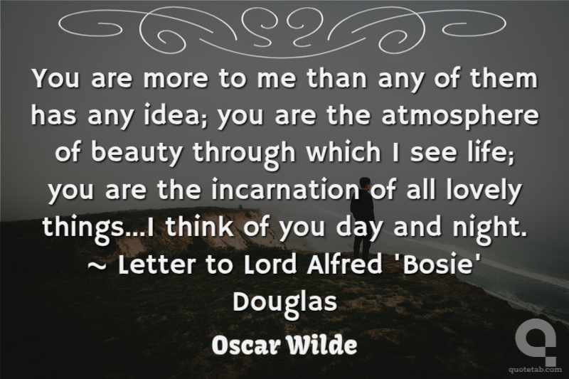 You are more to me than any of them has any idea; you are the atmosphere of beauty through which I see life; you are the incarnation of all lovely things...I think of you day and night. ~ Letter to Lord Alfred 'Bosie' Douglas