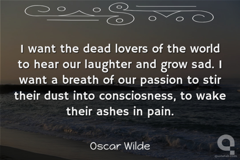 I want the dead lovers of the world to hear our laughter and grow sad. I want a breath of our passion to stir their dust into consciosness, to wake their ashes in pain.