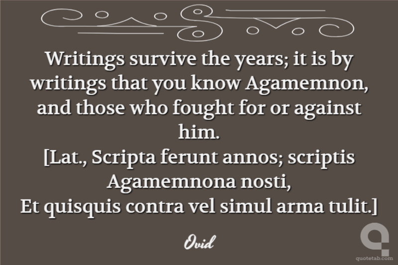 Writings survive the years; it is by writings that you know Agamemnon, and those who fought for or against him. [Lat., Scripta ferunt annos; scriptis Agamemnona nosti, Et quisquis contra vel simul arma tulit.]