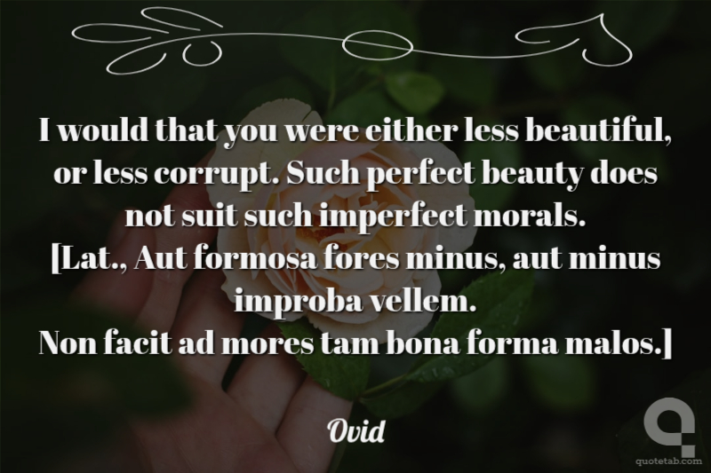 I would that you were either less beautiful, or less corrupt. Such perfect beauty does not suit such imperfect morals. [Lat., Aut formosa fores minus, aut minus improba vellem. Non facit ad mores tam bona forma malos.]