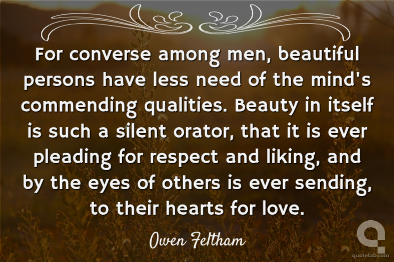 For converse among men, beautiful persons have less need of the mind's commending qualities. Beauty in itself is such a silent orator, that it is ever pleading for respect and liking, and by the eyes of others is ever sending, to their hearts for love.