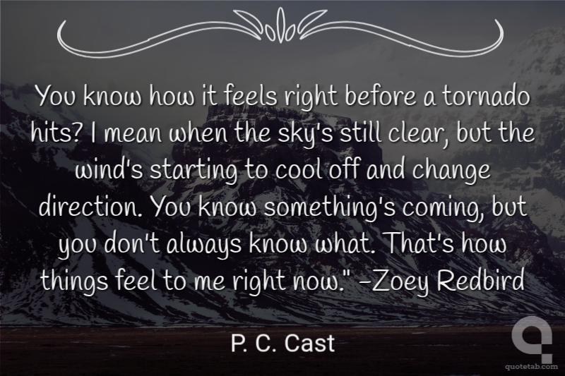 You know how it feels right before a tornado hits? I mean when the sky's still clear, but the wind's starting to cool off and change direction. You know something's coming, but you don't always know what. That's how things feel to me right now." -Zoey Redbird